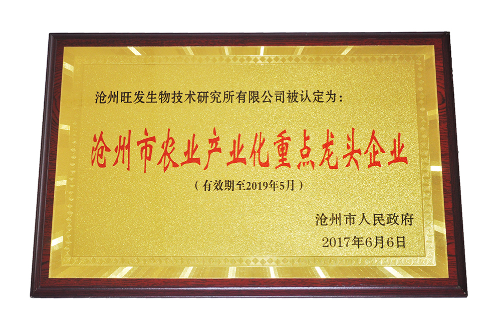 Certificate of key leading enterprises of agricultural industrialization in Cangzhou
